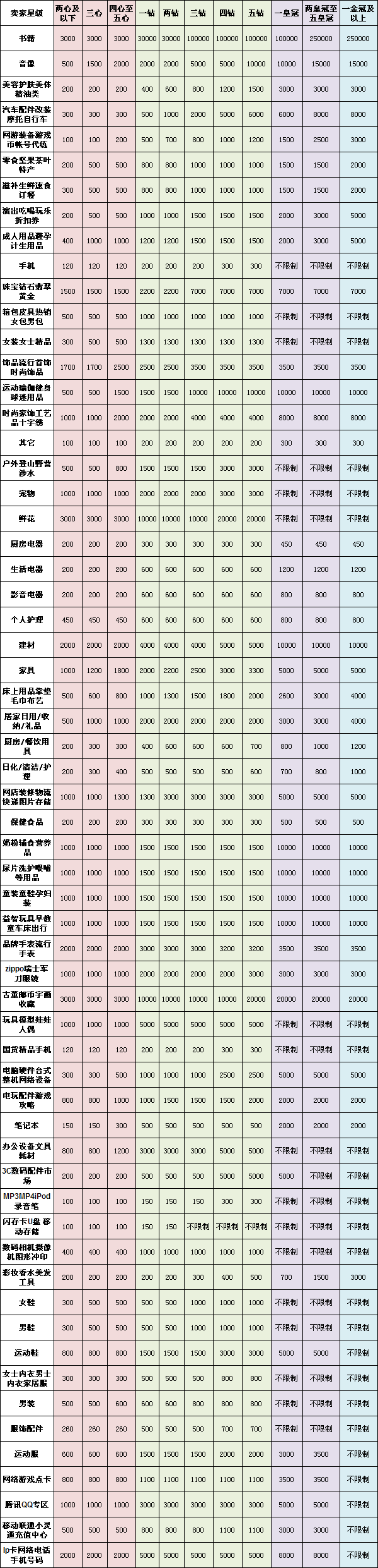 为改善消费者购物体验,给广大淘宝会员创造良好的交易环境,根据商品发布数量限制实际运行情况,对《商品发布数量限制说明》作调整,对已创建店铺的卖家,淘宝根据其所经营的类目、信用等级调整的可发布商品数量如下: